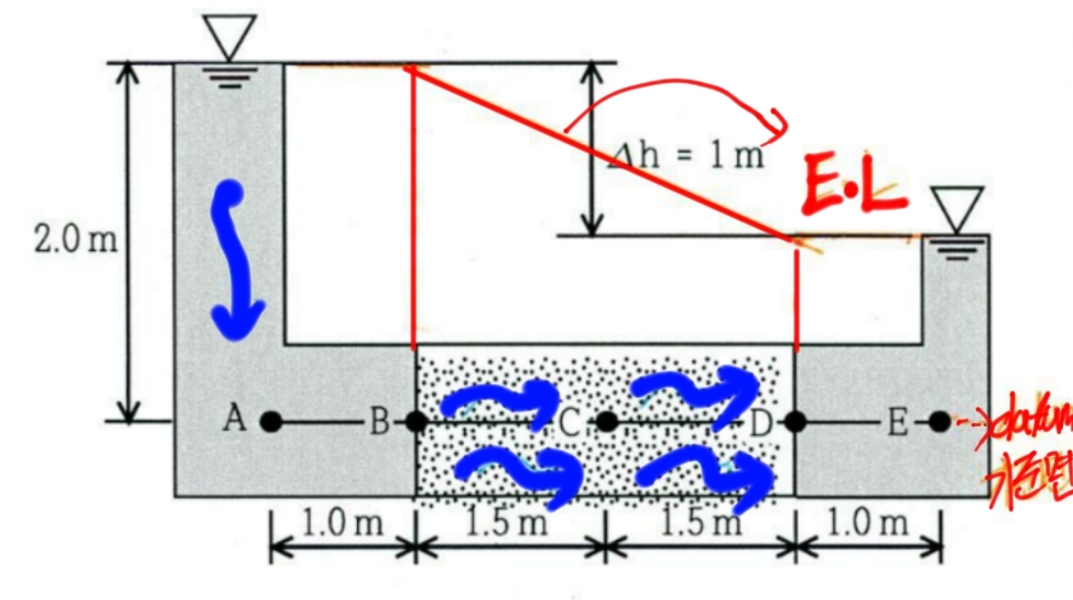 2) 면적과 흙이 변하지 않았으므로 1.5m당 수두손실은 0.5m이다