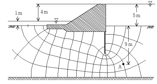 문 6. 그림과 같이 콘크리트 댐 아래 투수지반에 대한 유선망을 작도하였다. A점의 간극수압[tf/m²]은?